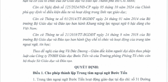 Giấy phép thành lập Trung tâm Ngoại ngữ